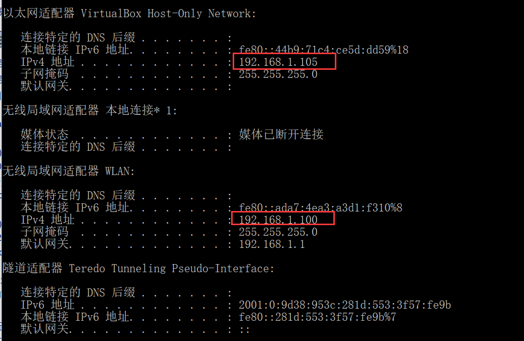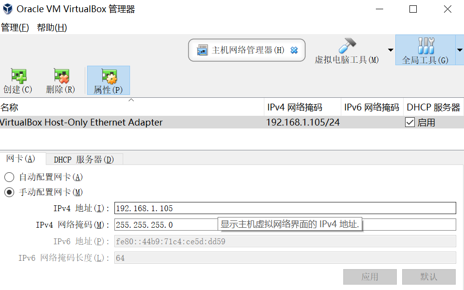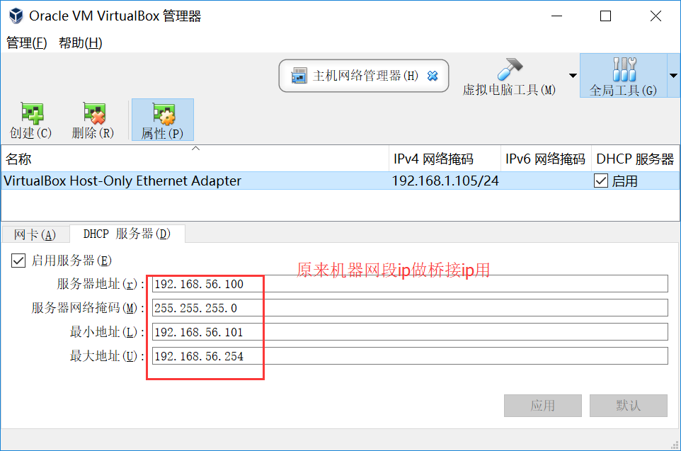 virtualbox host-only ethernet的IP:192.168.1.105 这样使两个系统处于同一个网段;