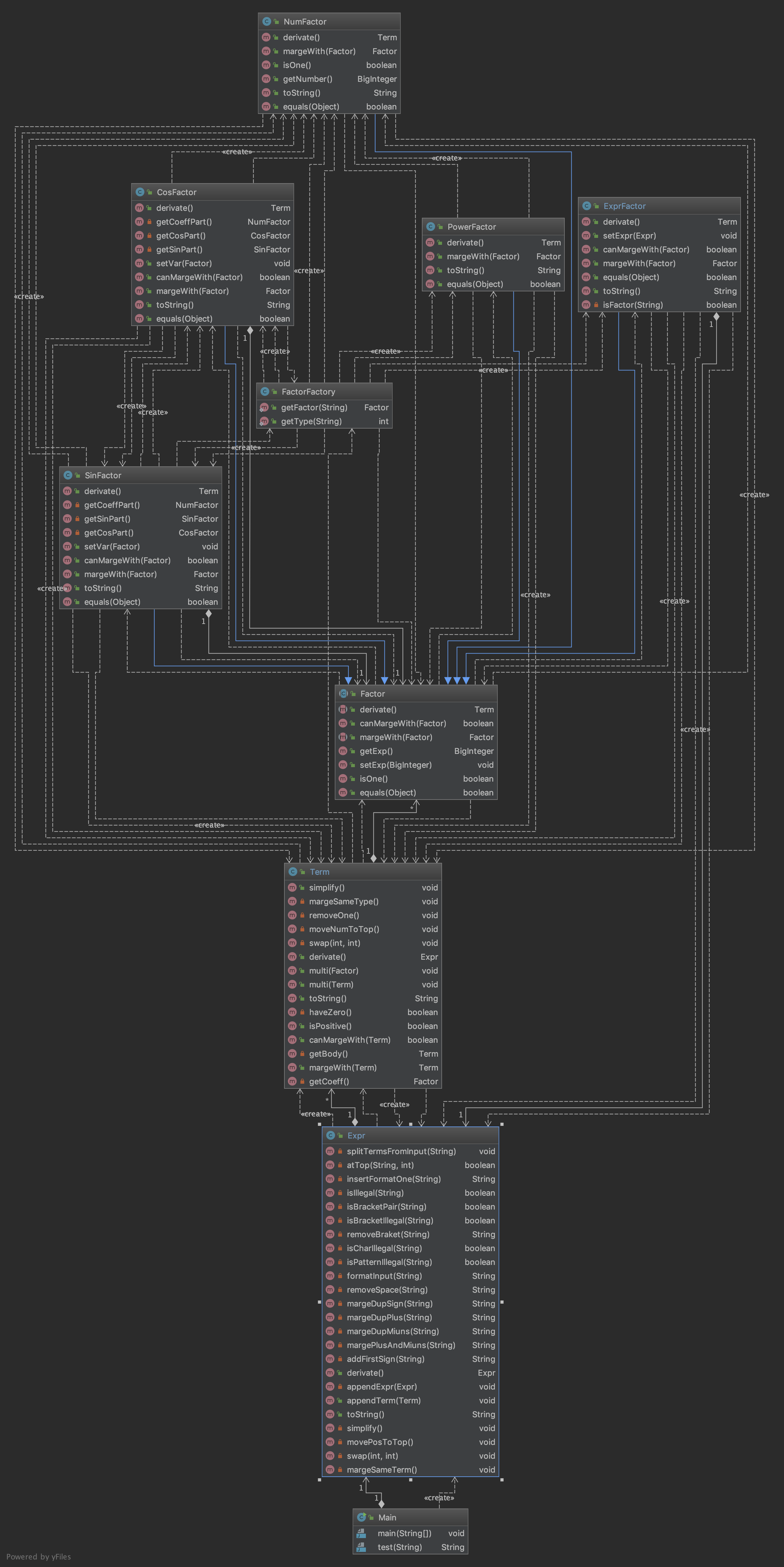 很庞大,但是其实就是因子继承虚基类,然后所有承在一起的因子构成一个所谓的Box,Box中用HashMap来维护三项,主体逻辑跟上一次完全相同,但是化简逻辑复杂了很多,从图中也可以看到有很多化简函数放在了里面,让人看不懂,这也是这三次作业的败笔所在,没有把化简功能分离出来,这样不仅不利于测试化简功能,而且程序的未知行为无法估测,这也是这样测试中出现Bug的一个十分重要的原因