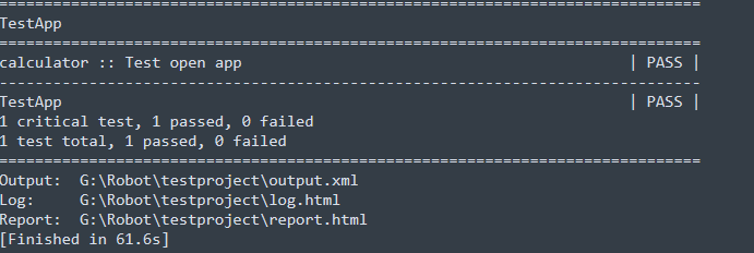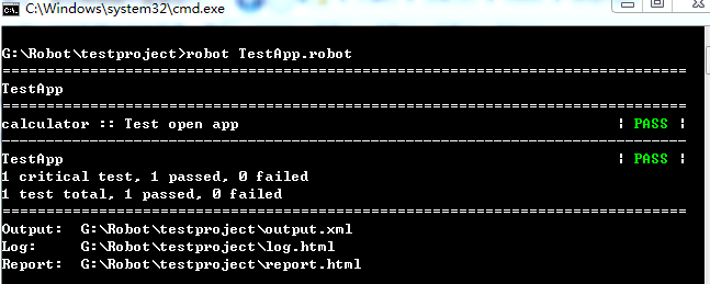 也可以用cmd切换到脚本所有目录,用命令robot TestApp.robot来执行,如下: