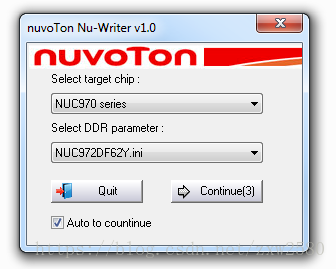 C.开启NuWriter选择NUC970系列芯片,并选择完成后按下“Continue”