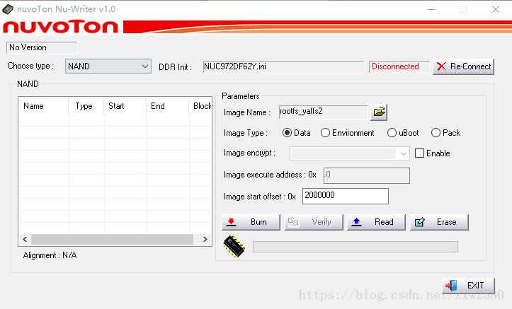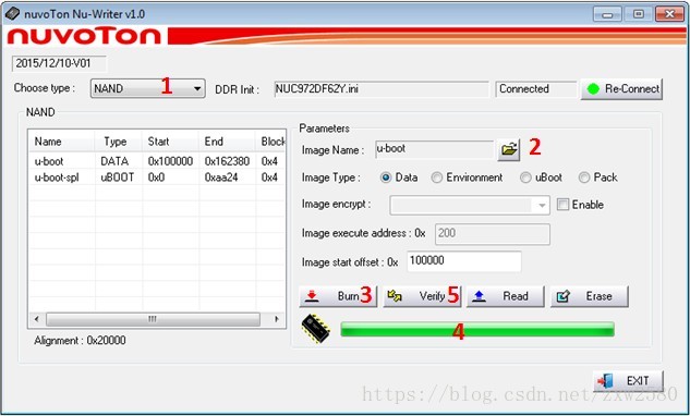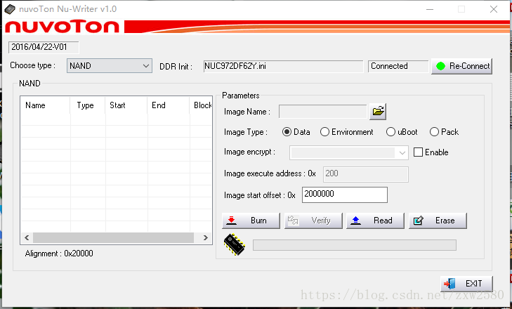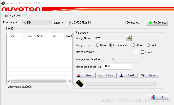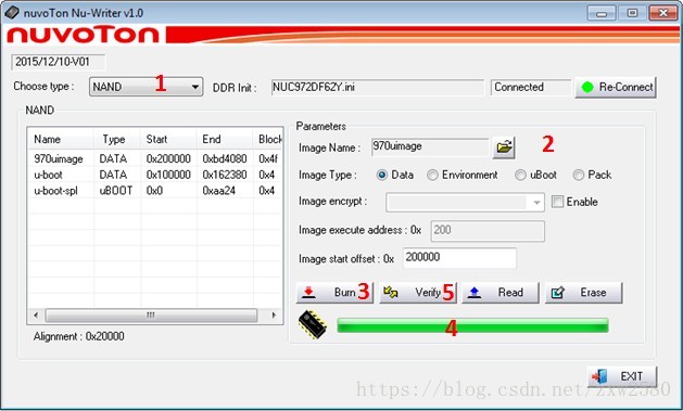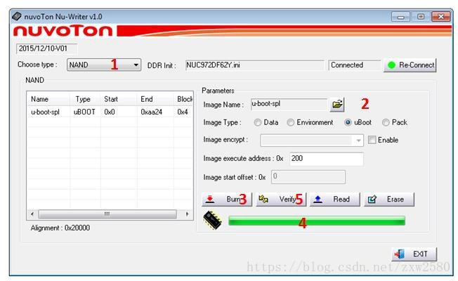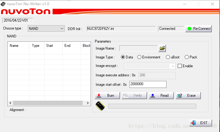 注意:NuWriter打开的时候,会自动连接开发板。Re-Connect指示灯会显示绿色。如果开发板重上电或复位,则需要按下Re-Connect键进行重新连接。