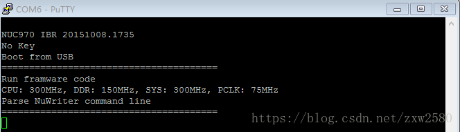 此信息代表开发板以USB方式启动。当NuWriter与开发板连接以后,串口打印信息如下: