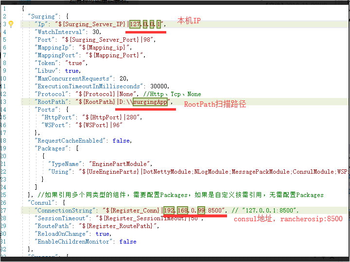 5.修改Surging.Services.Server下的surgingSettings.json (Rootpath: surging会扫描该路径,加载该路径下的模块)
