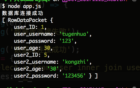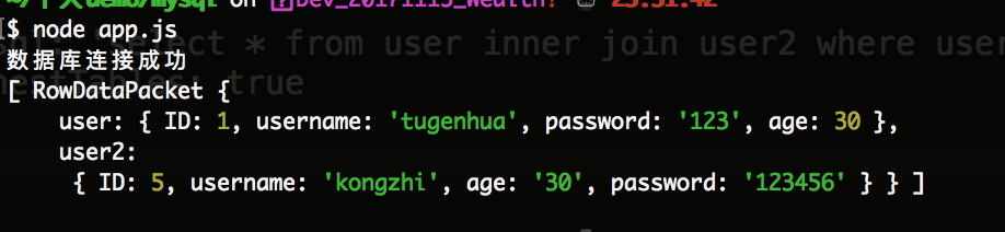 我们现在使用Connection对象的query方法结合查询这两张表中的所有数据,查询语句如下: