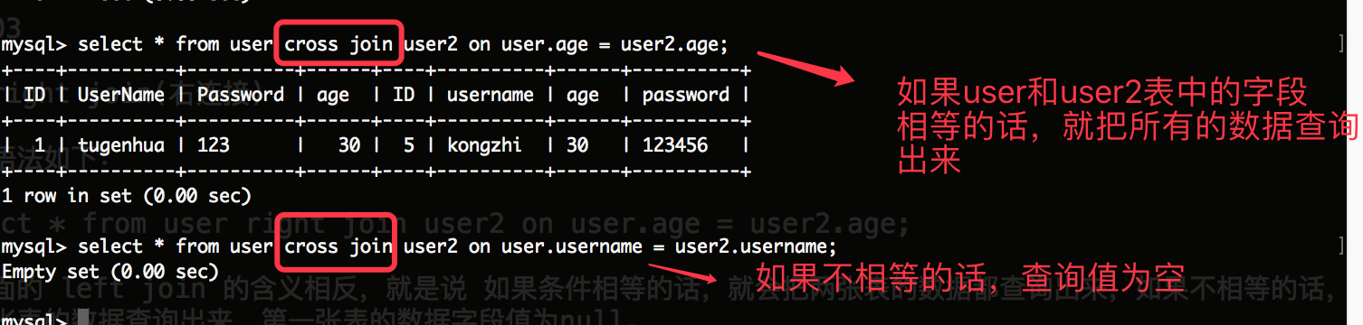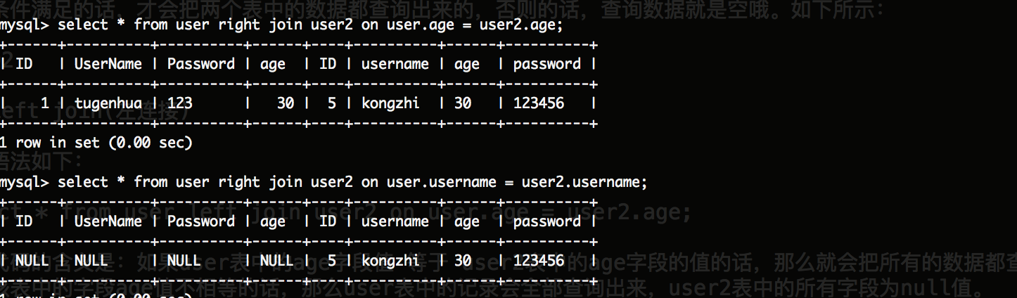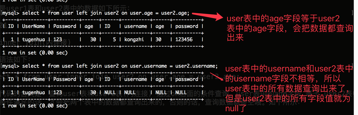 如上代码的含义是:如果user表中的age字段值 等于 user2表中的age字段的值的话,那么就会把所有的数据都查询出来,如果该表中的字段age值不相等的话,那么user表中的记录会全部查询出来,user2表中的所有字段为null值。