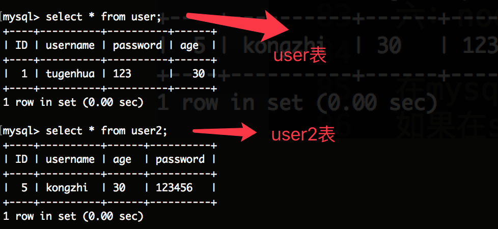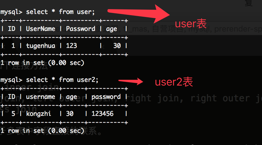 在mysql模块中,我们可以使用Connection对象的query方法的第一个参数编写sql语句来执行多表联合查询,但是如果在sql语句中指定了相同的字段(比如相同的字段在不同的表中),那么在默认的情况下,后面的字段会覆盖前面的字段查询出来的数据。从而不是我们想要的结果。我们是想要把这两张表的数据同时查询出来。为了演示下,我们新建两张表,一张是user表,该表有4个字段,分别是id,username, password, age; 另外一张表是user2表,该表有四个字段,分别是id,username,password,age等字段。如下所示: