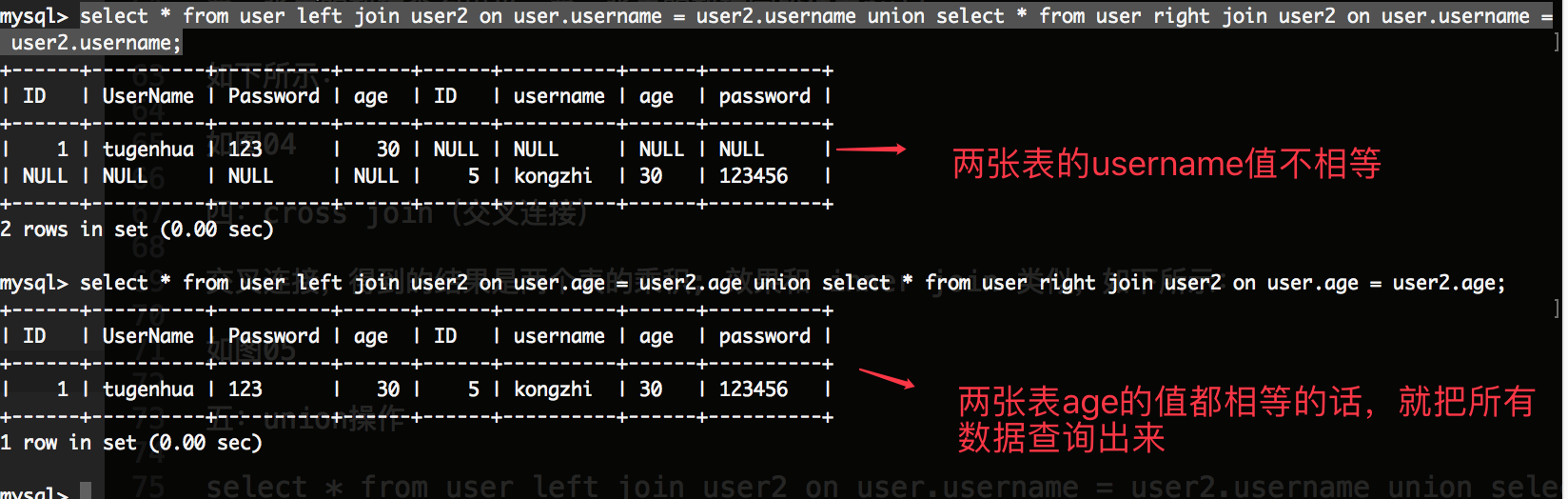 上面代码的含义是:查询user表和user2表,如果该两张表的username值相等的话,使用left join(左链接) 和 right join(右连接),如果都相等的话,就把两张表所有的数据查询出来。否则的话,两张表字段不相等的话,那么第一个条件 left join查询后的数据就是 按照user表查询出所有的数据,user2表中的数据字段值为null;union的含义的意思可以理解为或者的意思,我们可以理解它为or的意思,第二个条件是使用 right join 连接符,意思是如果username字段不相等的话,就按照第二张表的数据全部查询出来,第一张表的所有字段查询值为null。如下所示:
