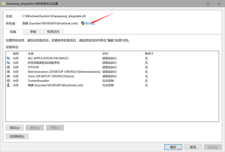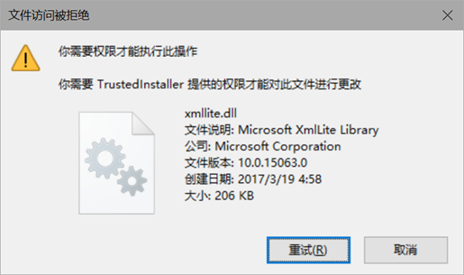 目标:将该文件重命名为其他名字,再人为创建一个假的文件命名为wuaueng.dll,达到偷梁换柱的效果。但是在重命名时会提示 "需要TrustedInstaller提供的权限才能对此文件进行更改"
