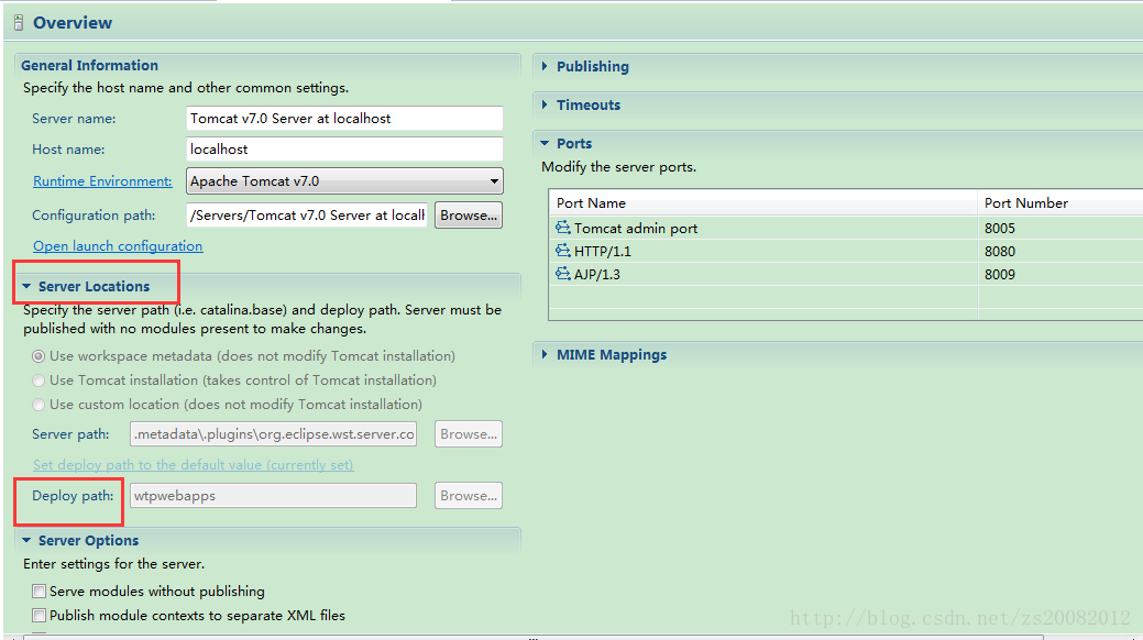 这时再次双击“Tomcat v7.0 Server at localhost”节点,使用Tomcat的安装目录作为部署的位置,并修改部署的路径Deploy path(建议改成Tomcat的webapps目录下),然后保存即可。