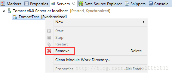 上图的红框部分表明,服务的部署是在eclipse里面(默认是放在工作空间里的.metadata文件夹下),而不是在Tomcat里面。我们来改一下,前提是工程并没有发布到Tomcat中去,那我们先把之前发布的版本删了吧(稍后重新发布):