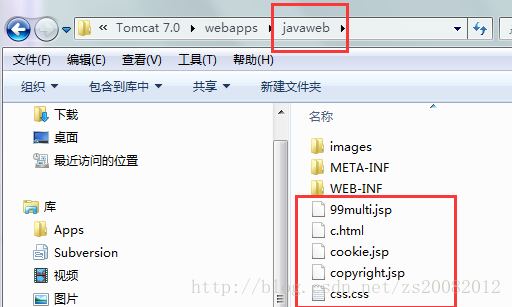 这时,重新运行程序。现在来到Tomcat的webapps目录下,发现多了一个javaweb文件夹(即工程文件名),并且文件夹下包含了工程文件中WebContent的内容: