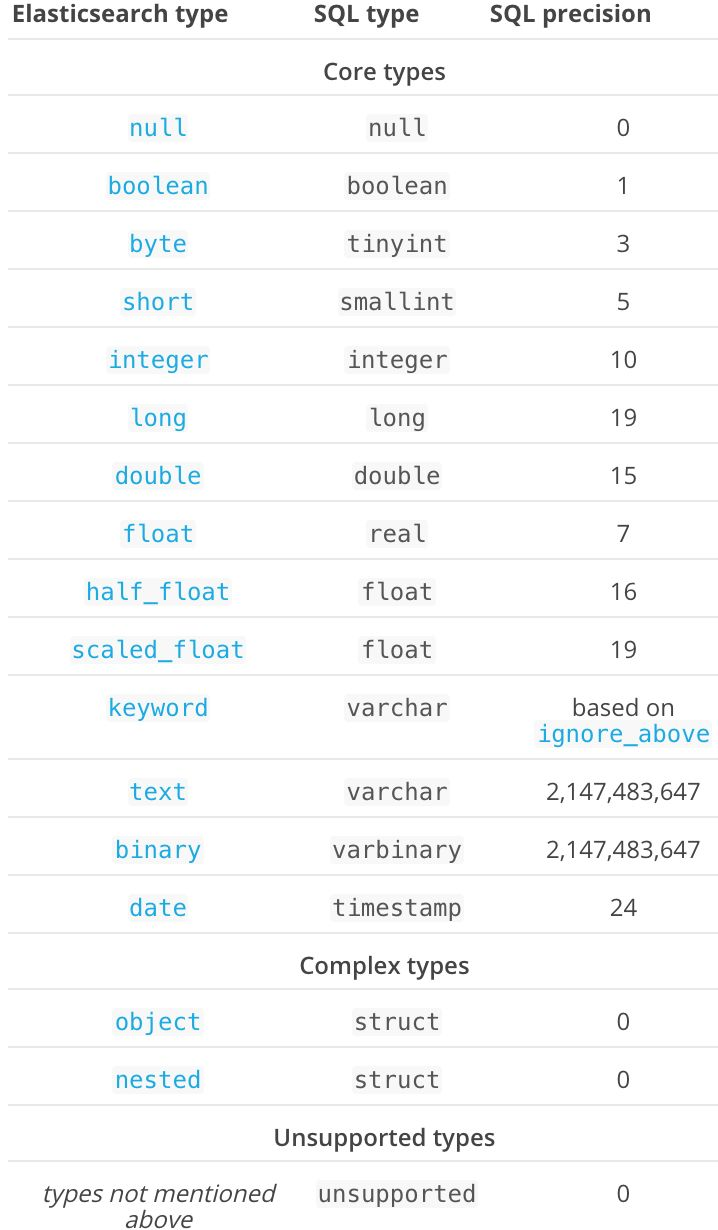 首先我们看下Elasticsearch SQL和标准SQL中数据类型的对应关系: