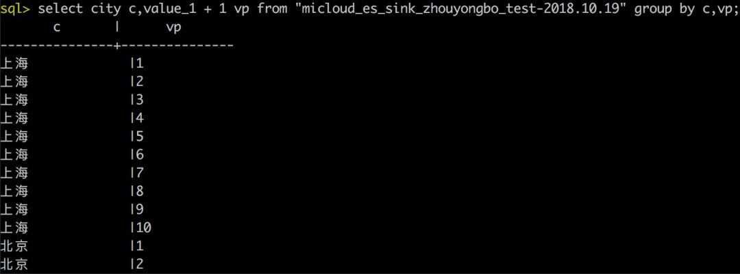 select city c,value_1 + 1 vp from "micloud_es_sink_zhouyongbo_test-2018.10.19" group by c,vp;