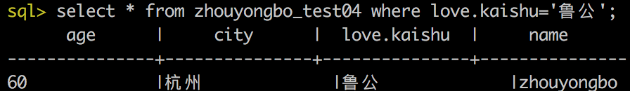 select * from zhouyongbo_test04 where love.kaishu=‘鲁公’;