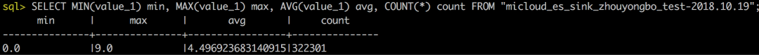 SELECT MIN(value_1) min, MAX(value_1) max, AVG(value_1) avg,SUM(value_1) sum,COUNT(*) count,COUNT(DISTINCT value_1) dictinct_count FROM "micloud_es_sink_zhouyongbo_test-2018.10.19”;