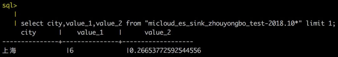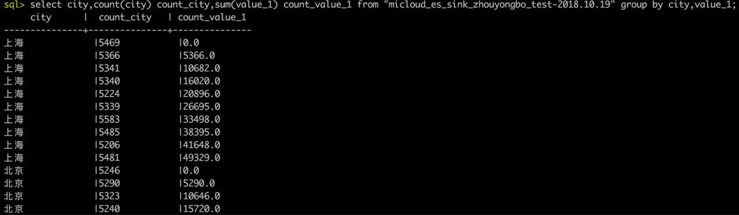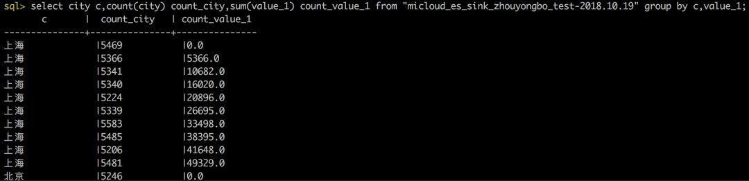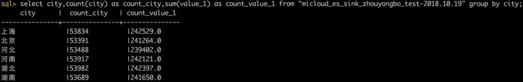 select city,count(city) as count_city,sum(value_1) as count_value_1 from "micloud_es_sink_zhouyongbo_test-2018.10.19" group by city;