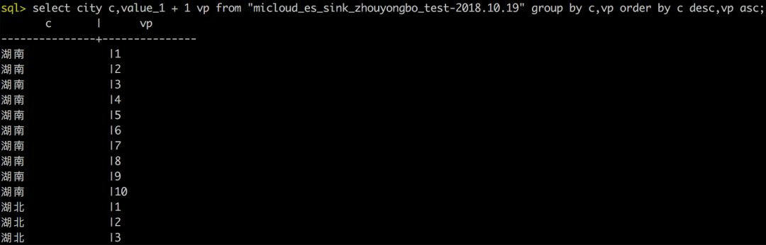 select city c,value_1 + 1 vp from "micloud_es_sink_zhouyongbo_test-2018.10.19" group by c,vp order by c desc,vp asc;