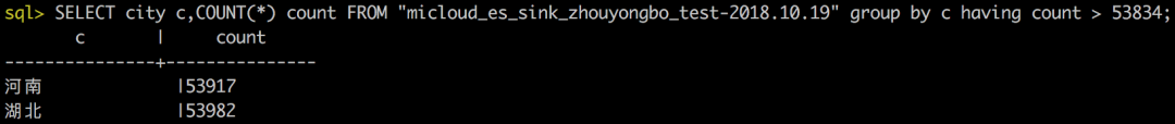Select city c,count(*) count from "micloud_es_sink_zhouyongbo_test-2018.10.19" group by c having count > 53834;
