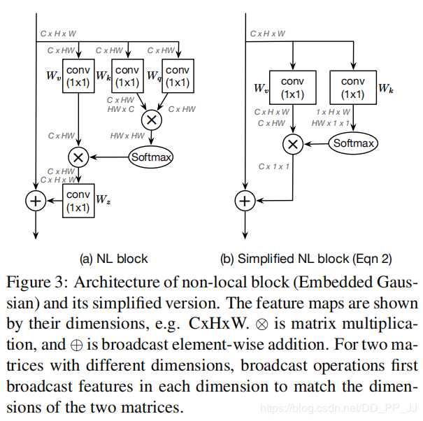 NLNet中提出了四个相似度计算模型,其效果是大概相似的。作者以Embedded Gaussian为基础进行改进,可以表达为: $$ W_{ij}=\frac{exp(W_qx_i,W_kx_j)}{\sum_{m}exp(W_qx_i,W_kx_m)} $$ 简化后版本的Simplified NLNet想要通过计算一个全局注意力即可,可以表达为: $$ z_i=x_i+W_v\sum^{N_p}{j=1}\frac{exp(W_kx_j)}{\sum^{N_p}{m=1}exp(W_kx_m)}x_j $$ 这里的$W_v、W_q、W_k$都是$1\times1$卷积,具体实现可以参考上图。