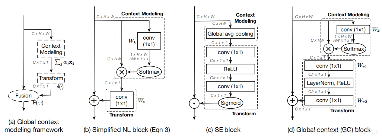 GCNet论文名称为:《GCNet: Non-local Networks Meet Squeeze-Excitation Networks and Beyond》,是由清华大学提出的一个注意力模型,与SE block、Non Local block类似,提出了GC block。为了克服NL block计算量过大的缺点,提出了一个Simplified NL block,由于其与SE block结构的相似性,于是在其基础上结合SE改进得到GC block。