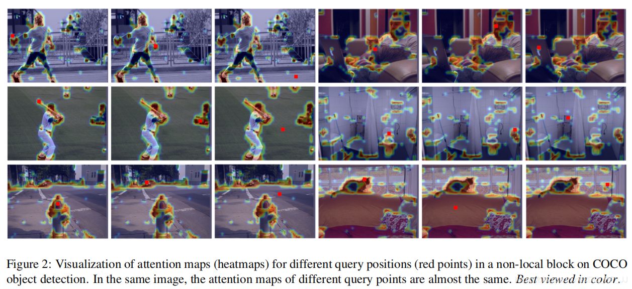 作者对NLNet进行试验,选择COCO数据集中的6幅图,对于不同的查询点(query point)分别对Attention maps进行可视化,得到以下结果: