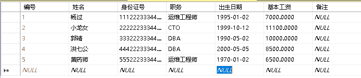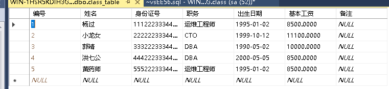 创建表1 create table xueyuan 2 ( 3 学员ID int primary key not null, 4 学员姓名 nvarchar(50) not null, 5 电话 decimal(11,0) not null, 6 出生日期 date not null 7 ) 8 9 create table chengji 10 ( 11 学员ID int not null, 12 课程ID int not null, 13 考试成绩 int not null, 14 考试日期 date not null 15 ) 16 17 create table kecheng 18 ( 19 课程ID int primary key not null, 20 课程名 nvarchar(50) not null 21 ) 22 23 24 25 insert into xueyuan 26 select 1,'老大',110,'2000/01/01' union 27 select 2,'老二',120,'2001/01/01' union 28 select 3,'老三',130,'2002/01/01' union 29 select 4,'老四',140,'2003/01/01' union 30 select 5,'老五',150,'2004/01/01' union 31 select 6,'老六',160,'2005/01/01' union 32 select 7,'老七',170,'2006/01/01' union 33 select 8,'老八',180,'2007/01/01' 34 35 insert into kecheng 36 select 1, 'Java' union 37 select 2,'HTML' union 38 select 3,'python' 39 40 insert into chengji 41 select 1,1,60,'2000/01/01' union 42 select 2,2,55,'2005/01/01' union 43 select 3,2,70,'2006/01/01' union 44 select 4,1,92,'2000/01/01' union 45 select 5,3,80,'2007/01/01' union 46 select 6,3,49,'2002/01/01' union 47 select 7,2,95,'2006/01/01' union 48 select 8,1,88,'2018/01/01'