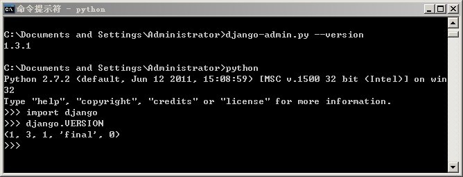 从图中看到,我们首先在操作系统提示符下执行 “django-admin.py --version”,系统打印出Django的版本号“1.3.1”。接着我们输入“Python”进入到python运行环境,在 “>>>”提示符下,我们输入一个python的模块导入语句 “import django”,这个语句表示我们在目前 python 运行环境中引入"django"这个功能模块;然后我们使用这个功能模块的“VERSION”方法来查看这个模块的版本号,同样我们也看到了相同的版本 号。如果你的电脑上也完整的看到这些信息的话,那么OK,这证明你的电脑已经可以开始执行基于Django系统的python程序了。
