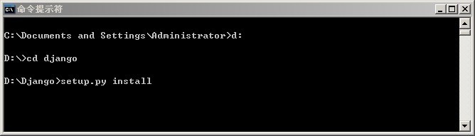 下载Django目前最新版本 Django-1.3.1.tar.gz。 我们下载的这个Django-1.3.1.tar.gz文件是一个标准的Unix压缩格式的文件,我们在Windows下也可以使用WinRAR之类的软 件进行解压,解压之后我们得到一个Django-1.3.1的目录,假设我们解压到D:\Django目录。我们打开DOS命令提示窗口,进入这个目录, 然后执行python setup.py install 这个命令来开始Django的安装。如图5。