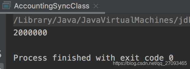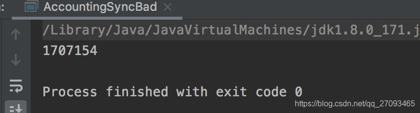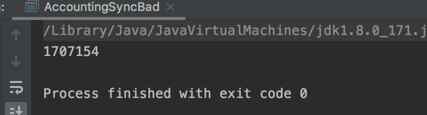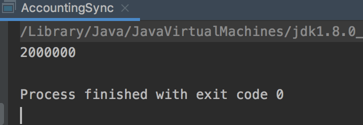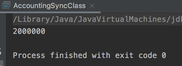 上述代码与前面不同的是我们同时创建了两个新实例AccountingSyncBad,然后启动两个不同的线程对共享变量i进行操作,但很遗憾操作结果是1707154而不是期望结果2000000,因为上述代码犯了严重的错误,虽然我们使用synchronized修饰了increase方法,但却new了两个不同的实例对象,这也就意味着存在着两个不同的实例对象锁,因此t1和t2都会进入各自的对象锁,也就是说t1和t2线程使用的是不同的锁,因此线程安全是无法保证的。解决这种困境的的方式是将synchronized作用于静态的increase方法,这样的话,对象锁就当前类对象,由于无论创建多少个实例对象,但对于的类对象拥有只有一个,所有在这样的情况下对象锁就是唯一的。下面我们看看如何使用将synchronized作用于静态的increase方法。