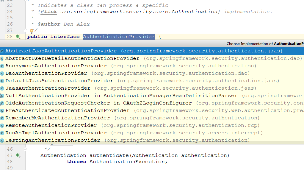 AuthenticationProvider接口是用于认证的,可以通过实现这个接口来定制我们自己的认证逻辑,它的实现类有很多,默认的是JaasAuthenticationProvider