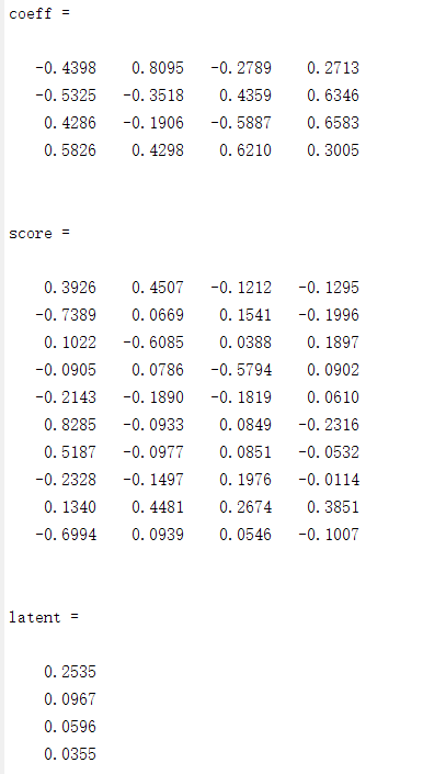 eg:使用pca()函数对一个10×4维的随机矩阵进行主成分分析的结果如下。