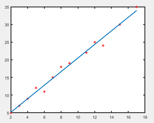 把点对(2,5)、(3,7)、(4,9)、(5,12)、(6,11)、(7,15)、(8,18)、(9,19)、(11,22)、(12,25)、(13,24)、(15,30)、(17,35)规约成线性函数$y = wx + b$,即拟合函数 $y = 2x + 1.3$ 线上所对应的点可以近似地看做是已知点,如图4-9所示。