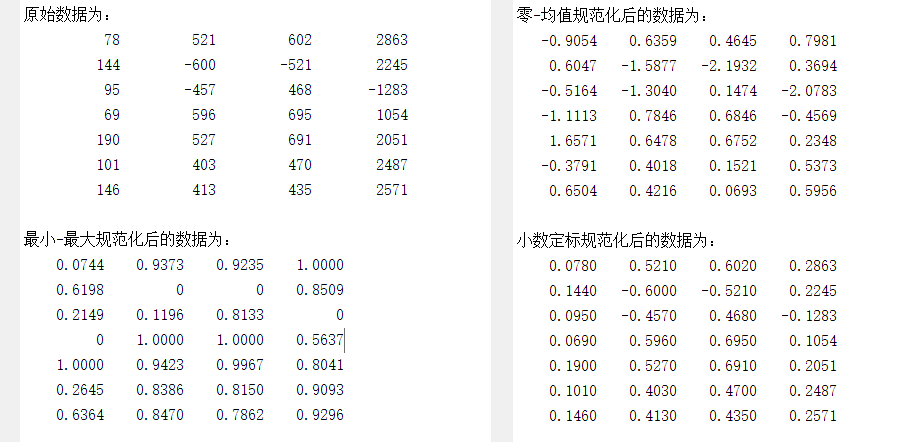 使用格式:Z=zscore(x),对样本矩阵X进行标准差的标准化,返回标准化后的结果到z矩阵中。
