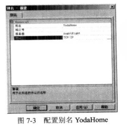 图7-3显示了给命名实例 AUGHTEIGHTDAGOBAH配置的别名 Yodahome。要打开