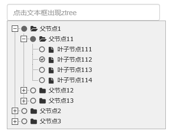 <input type="text" class="form-control" id="txt_ztree" placeholder="点击文本框出现ztree" onclick="showMenu()" />