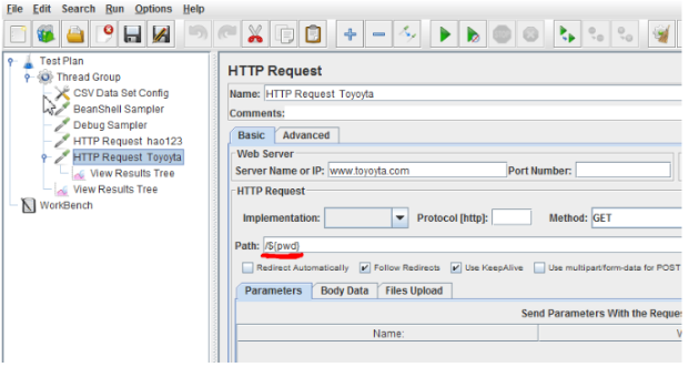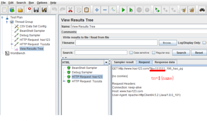 下面是添加一个Debug sampler(里面什么也不用,设置保持默认) 和两个http request