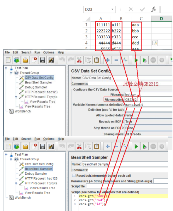 jmeter 读取excel数据使用的方法是使用Jmeter CSV Data Set Config参数化