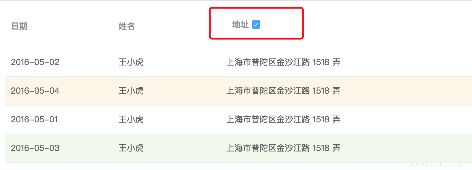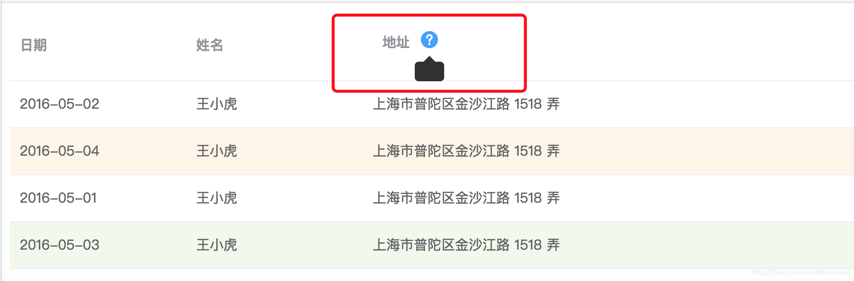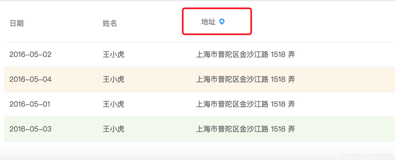 以element-ui官方文档一个table表格为例,我们在地址的后面加一个定位标志的图标,代码如下: