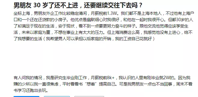 @被咬过的馒头:你的焦虑并不来源于赚多赚少,而是不稳定性,而你男朋友看上去比你稳定多了,清闲一点很正常,要不是害怕失业又有谁想996呢,你们三观差太多了,分了吧