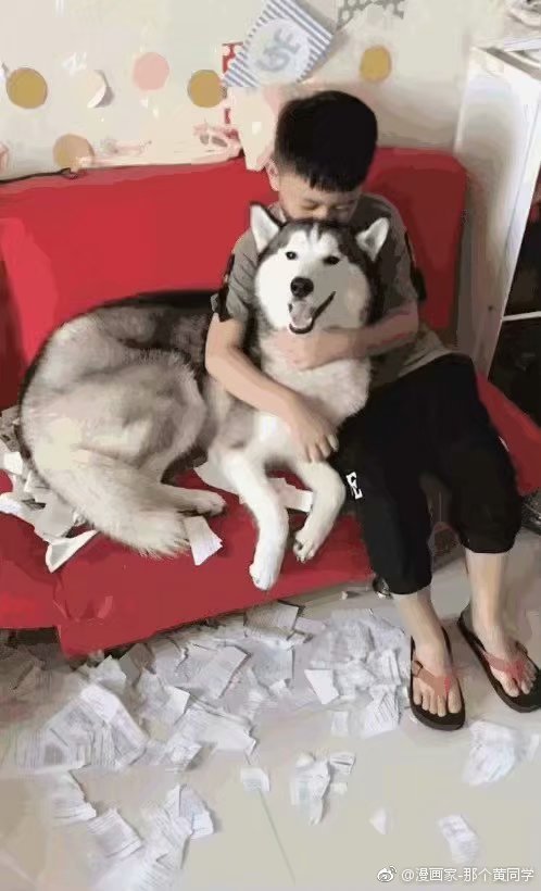 “哈士奇把我作业撕了,我得把笑脸藏起来。”