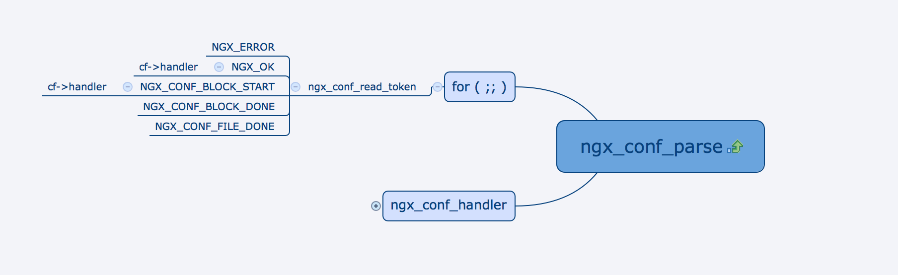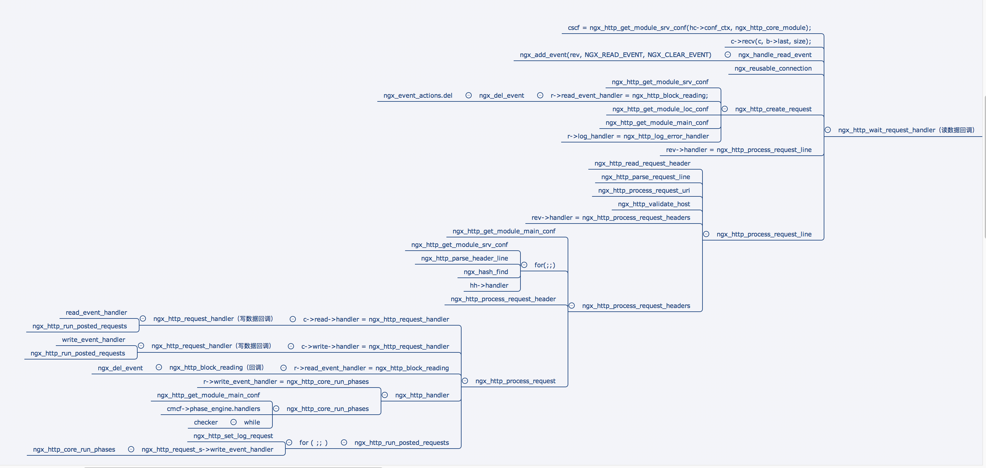 这个脑图在 nginx-1.14.0-research 上。这是我在研究nginx的http模块的时候画的。基本上把 Nginx 主流程(特别是 HTTP 的部分)的关键函数和关键设置画了下来,了解了这个脑图,就对整个 Nginx 的主流程有了定性的了解了。