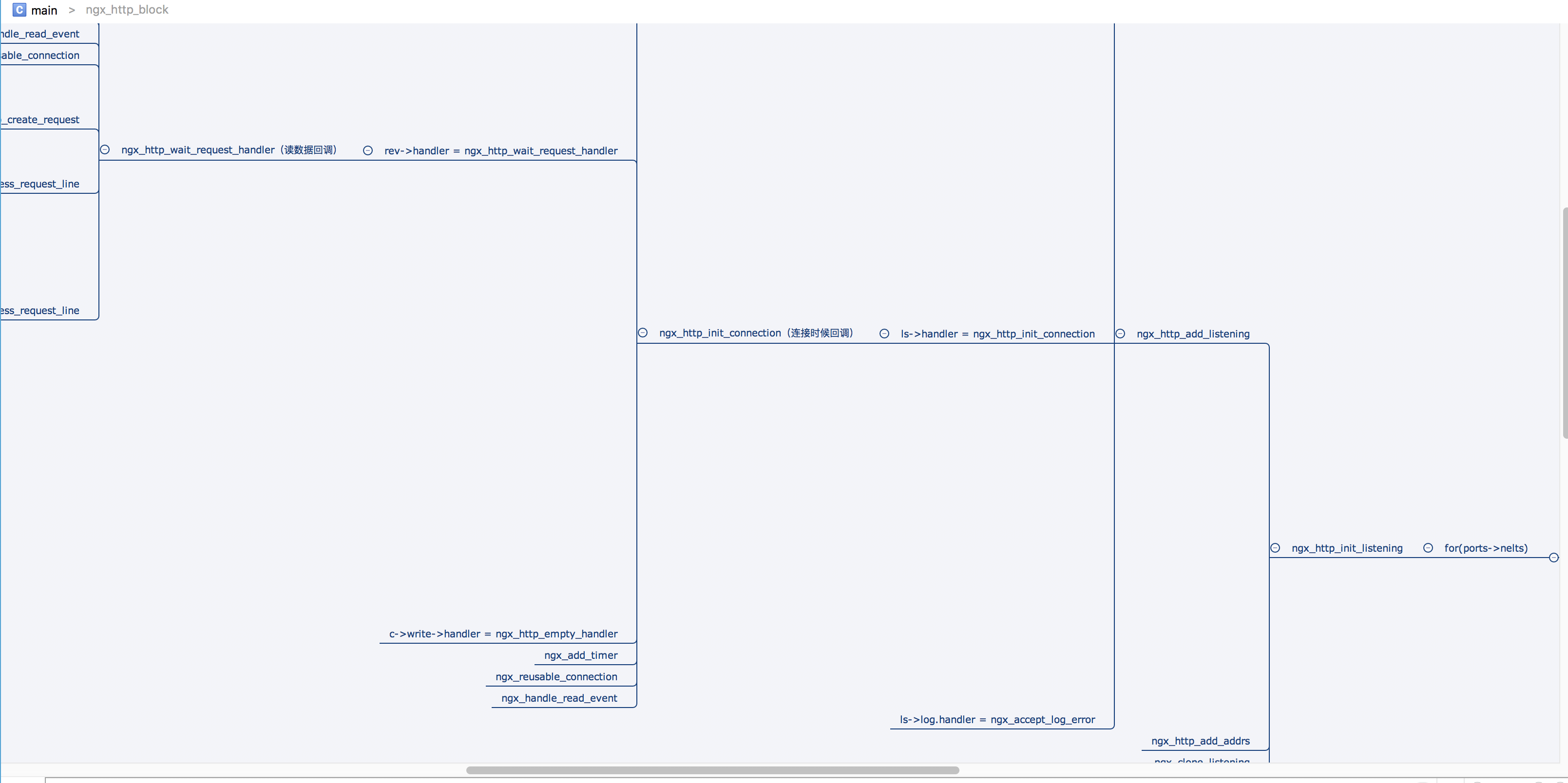 我们继续跟着ngx_http_optimize_servers,ngx_http_init_listening,ngx_http_add_listening,ngx_http_init_connection 进入到处理http请求内容的函数里面。