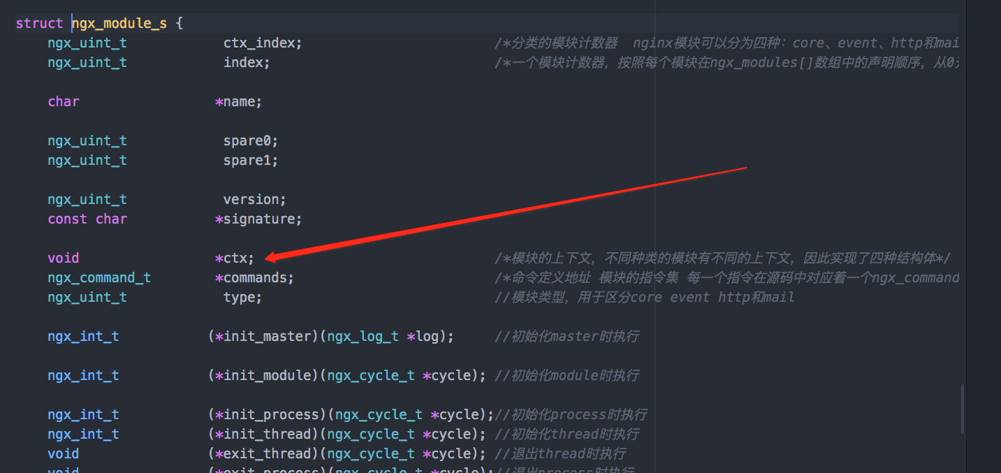里面有个结构*ctx,对于不同的模块类型,这个ctx指向的结构是不一样的,我们这里最主要是研究 HTTP 类型的模块,所以我们就记得 HTTP 模块指向的结构是ngx_http_module_t