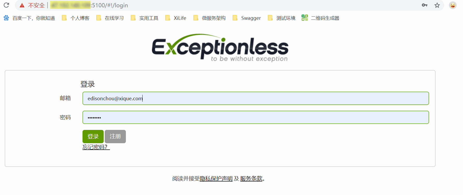 (1)访问你的服务器IP:5100 即可访问Exceptionless Web管理登录界面,如果你能看到,那么代表部署成功了。注册一个账号,然后登陆吧。