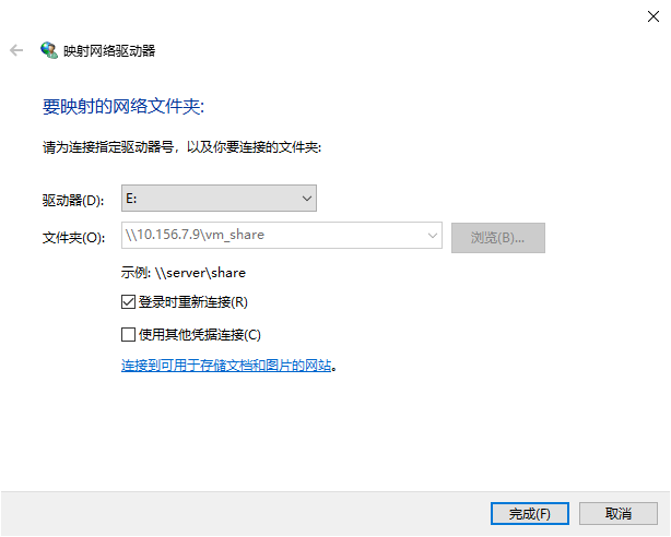 右键共享的文件夹,选择映射网络驱动器,设置如下: