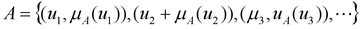 可以看出, 对于模糊集A,当U中的元素u的隶属度全为0时, 则A就是个空集;反之,当全为1时,A就是全集U;当仅取0和1时, A就是普通子集。 这就是说,模糊子集实际是普通子集的推广, 而普通子集就是模糊子集的特例。