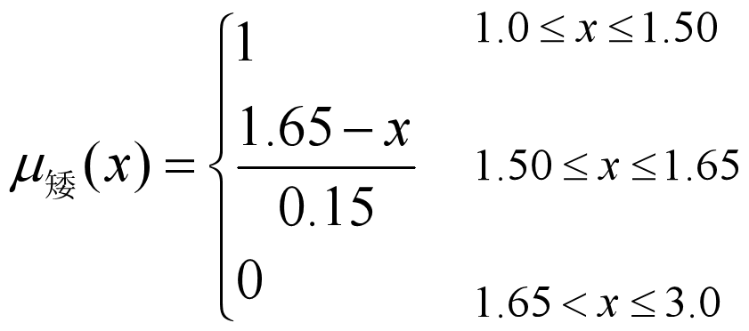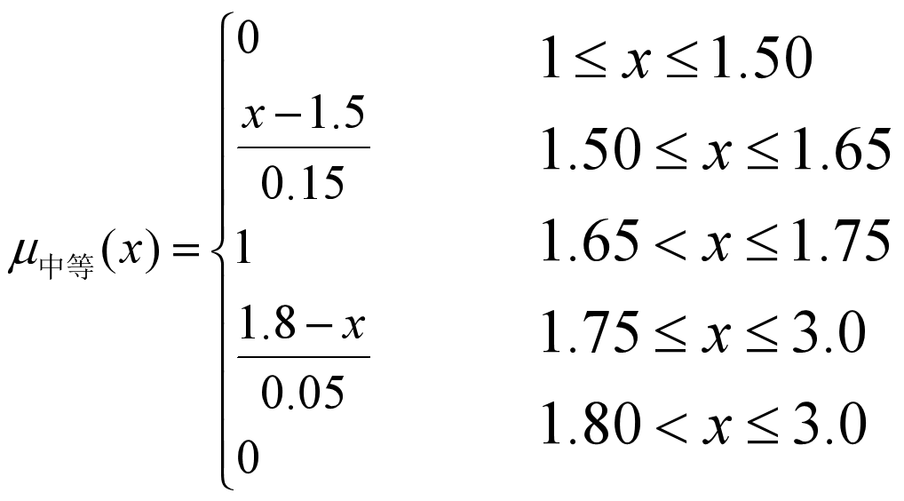 取人类的身高范围[1.0, 3.0]为论域U, 在U上定义隶属函数μ矮(x)、μ中等(x)、μ高(x)如下(函数图像如图8-5所示)。 这三个隶属函数就确定了U上的三个模糊集合,它们也就是相应三个语言值的数学模型。