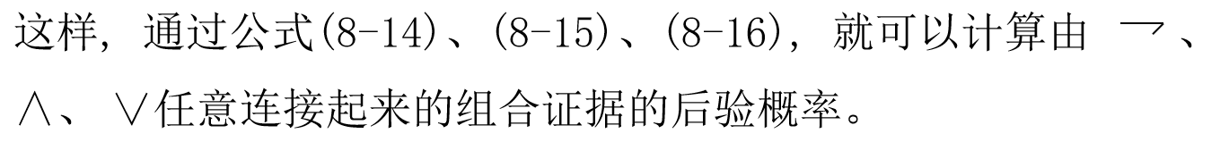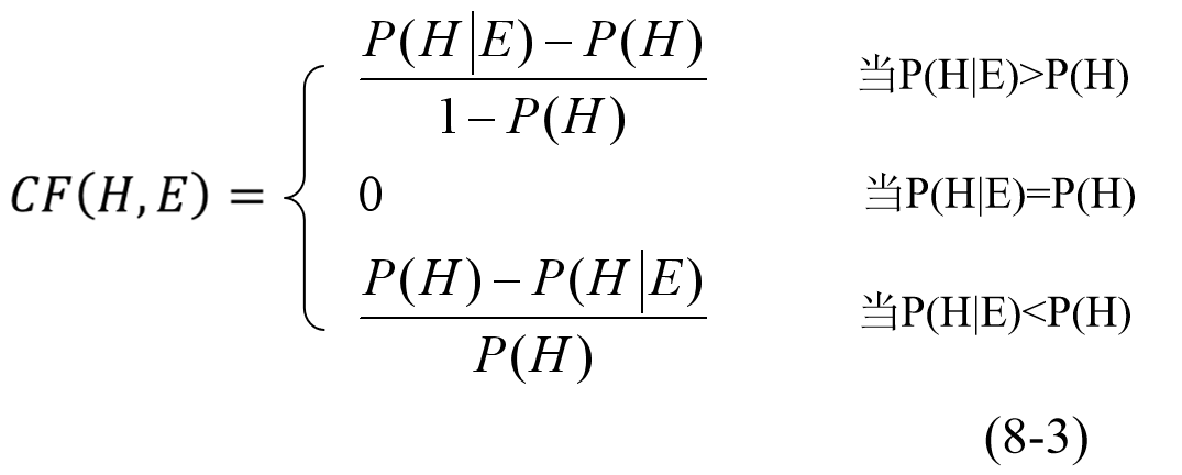 信度一般是基于概率的一种度量,或者就直接以概率作为信度。例如, 在著名的专家系统MYCIN中的信度就是基于概率而定义的, 而在贝叶斯网络中就是直接以概率作为信度的。对于上面的(8-1)式, 要直接以概率作为信度则只需取C(B|A)=P(B|A)(P(B|A)为A真时B真的条件概率)即可。