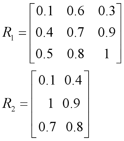 就像通常的关系可用矩阵表示一样,模糊关系也可以用矩阵来表示。例如上面的“远大于”用矩阵可表示如下: