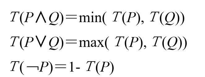 此式把模糊命题的真值定义为一个区间[0, 1]中的一个实数。 那么,当一个命题的真值为0时, 它就是假命题;为1时,它就是真命题;为0和1之间的某个值时, 它就是有某种程度的真(又有某种程度的假)的模糊命题。